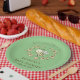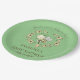 Whimsical baby shower paper plates feature a cute bee and flower wreath with customisable text on green background.