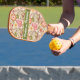 This pretty tan pickleball paddle has a whimsical pattern of folk art type flowers, birds, hearts, branches, and foliage in warm earth-tones of tan, peach, burgundy, green, yellow, orange, and pink with white customisable lettering on the front and back on top of a green and yellow band across the paddle. The front side says, "Hooked on Pickleball" and the back says, "Paddle Pro" next to a green pickleball that you can remove if you prefer. You can change either side to say whatever you want them to. Email niteowlstudio@gmail.com with any request for changes.