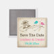 This whimsical and romantic love birds save the date wedding magnet has a pair of lovebirds on it in shades of pink and and turquoise blue with a couple of red hearts floating between them as they sit on a brown cherry blossom branch that has taupe and grey leaves and an ornate scrolled bird cage on it. The background is a creamy beige FAUX aged linen fabric look that matches the shabby chic wedding invitation design shown below. It is easily customised with your own information. ****Please note that everything will print as it appears on your monitor. Zazzle will not edit anything for typos or misalignment etc., and I will not see it once you have ordered it. If you need help with your wording, please email me BEFORE you order. If there are any other items you need to make your event extra special, please email your request to niteowlstudio@gmail.com.