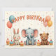 A heartwarming birthday scene where a bunny, elephant, and bear sit together among balloons and cupcakes, celebrating with joy and innocence. A poetic moment of childhood magic, friendship, and festive cheer captured in gentle pastel tones.