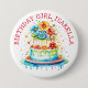 Personalised Red and Blue Whimsical Birthday Cake Watercolor Illustration birthday girl button.