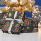 Whimsical wrapping paper featuring hand-painted illustration of festive mushrooms. A merry mushroom builds a snowman in front of her red mushroom house. A frog and toad enjoy a hot cup of cocoa. And a snail carries a Christmas gift through a mushroom and candy cane forest.