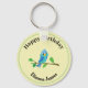 This cheerful keychain design features a cute blue bird perched on a leafy branch within a soft circular layout. The gentle pastel background and friendly illustration create a warm, playful aesthetic that feels perfect for birthday-themed designs. Inspired by nature and child-friendly artwork, this round design adds a joyful and charming look to everyday accessories.