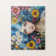 Whimsical Blue Hair Girl with Flowers Paint Drips Jigsaw Puzzle
