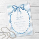 This whimsical bridal shower invitation features a soft blue watercolor bow and a playful scalloped oval frame against a classic blue and white striped background. Perfect for a shower with a preppy or coastal aesthetic, this charming design provides a sweet, hand-painted look for your special celebration. Created by Simply Farmhouse Press.