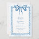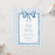 This whimsical invitation features a soft blue watercolor bow and a playful scalloped rectangle frame against a classic blue and white striped background. Perfect for a wedding with a preppy or coastal aesthetic, this charming design provides a sweet, hand-painted look for your special celebration. Created by Simply Farmhouse Press.