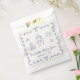 Cute light cream favour bags for your baby boy shower featuring a french blue wavy frame adorned with bows, whimsical hand-drawn illustrations of hearts, stars, cake and nursery decor, and the name of the mother-to-be showcased in a fun, playful blue script.