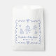 Cute favour bags for your baby boy shower featuring a french blue wavy frame adorned with coquette bows, whimsical hand-drawn illustrations of hearts, stars, cake and nursery decor, and the name of the mother-to-be showcased in a fun, playful blue script.