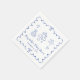 Cute napkins for your baby boy shower featuring a french blue wavy frame adorned with bows, whimsical hand-drawn illustrations of hearts, stars, cake and nursery decor, and the name of the mother-to-be showcased in a playful blue script.
