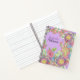 This customisable notebook features a vibrant and intricate floral print that is sure to catch the eye. The backdrop is a soft lavender hue that accentuates the lively colours of the flowers and leaves, creating a visual symphony of pinks, greens, yellows, and blues. Each element of the design is meticulously detailed, offering an aesthetic appeal that transforms this notebook into a piece of art. The spiral binding on the left side makes it easy to flip through the pages, and the centre has space for customisation.