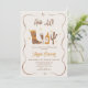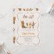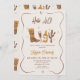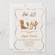 Whimsical women's birthday invitation featuring a cowgirl boot, bottle, glass and cactus in brown and orange.  This birthday invitation also features a quirky frame with hearts and retro stars.