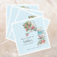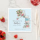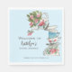 Whimsical bridal shower tea party napkins feature watercolor illustration of stacked floral teapot and teacups on light blue background. Matching paper plates available.