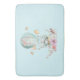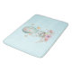 A bath mat with a charming illustration of a little bunny riding along in a hot-air balloon decorated with a fancy pink ribbon, along with some flowers and butterflies. A pastel blue background gives it a vintage dreamy feel.