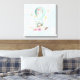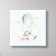 A canvas print with a charming illustration of a little bunny riding along in a hot-air balloon decorated with a fancy pink ribbon, along with some flowers and butterflies. A pastel blue watercolor background gives it a vintage dreamy feel.