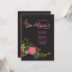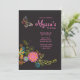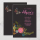 A lovely invitation featuring a whimsical butterfly and a spray of colourful fantasy flowers against a black background. Well suited for any age female.