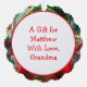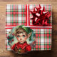 A sweet Christmas to and from gift tag that doubles as an ornament with a cute elf cartoon and a festive background.