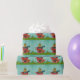 Wrapping paper with an image of an adorable orange cat sitting in a teacup. Wearing warm winter clothing. Snowflakes falling against a light green background. Christmas tree border underneath the teacups.