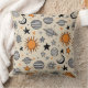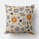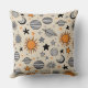 Whimsical celestial doodle pattern throw pillow with suns, moons, planets, and stars in warm earthy tones—ideal for nursery themes, kids’ gifts, and space-loving.