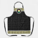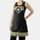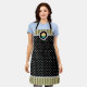 © 2020 Socialite Designs Inc. Whimsical apron with a black and white polka-dot background, yellow stripe on upper and lower hemline, and a cherry cupcake in a circle.