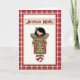This fun, country style greetings card in the French languagehas a plaid pattern background in red and white with fun Christmas font and a cute Christmas angel in festive red and green clothing with a Christmas tree on it and holly and berries in her hair. Incoporates some graphics by Whimsy Primsy.