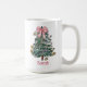 Charming Christmas mug featuring the "Oh Come Let Us Adore Him" verse and a playful tree design, suitable for a 15-ounce size, with an 11-ounce option also available. It is microwave and dishwasher safe.
