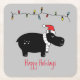 Whimsical black hippo illustration with red Santa hat, a string of holiday lights and customisable "Happy Holidays" text
