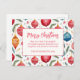 Bring a smile to the faces of your friends and relatives when they receive your Christmas postcard with this whimsical ornaments design and "Merry Christmas" greeting. The pattern is very cute with bright, cheery holiday colours of red, blue, and yellow in vintage watercolor. Bits of Yuletide ephemera and wisps of pine tree boughs are additional decorative accents. All the text, which is in red typography, can be edited. Be sure to change the example family name and year to the ones you want.