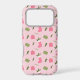 Cute pink and green hand drawn whimsical Christmas pattern iPhone case. This fun holiday design features an illustration of stockings, presents and greenery on a light pink background.