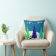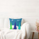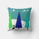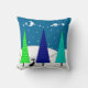 Retro Christmas Trees and Cat Pillow Pillow, three artsy retro trees in shades of teal and blue on a darker teal and blue background. Trees outlined with snowy hills and black cat. Back of pillow in coordinating colours but background is a lighter blue/green colour.