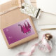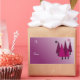 A modern design featuring whimsical Christmas trees in shades of purple on a shaded purple background. Little snowflakes accent it.