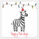 New modern, non-traditional holiday design for 2020 features a whimsical hand drawn zebra illustration with red Santa hat, a string of holiday lights and customisable "Happy Holidays" text