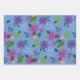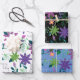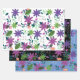Pretty and whimsical set of colourful floral Happy Birthday wrapping paper sheets. White, black and blue violet backgrounds.