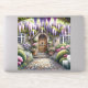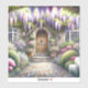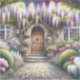 This enchanting scene captures the essence of a storybook cottage garden, bursting with lush blooms and cascading wisteria in soft purples, pinks, and whites. A charming arched wooden door welcomes you through a stone path framed by flowering shrubs, manicured greenery, and dreamy light filtering through the foliage. The overall mood is peaceful, romantic, and full of secret garden nostalgia—perfectly aligned with cottagecore and fairytale aesthetics. The composition draws you inward, evoking a sense of wonder and serenity beneath the floral canopy. AI generated artwork.