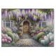 This enchanting scene captures the essence of a storybook cottage garden, bursting with lush blooms and cascading wisteria in soft purples, pinks, and whites. A charming arched wooden door welcomes you through a stone path framed by flowering shrubs, manicured greenery, and dreamy light filtering through the foliage. The overall mood is peaceful, romantic, and full of secret garden nostalgia—perfectly aligned with cottagecore and fairytale aesthetics. The composition draws you inward, evoking a sense of wonder and serenity beneath the floral canopy. AI generated artwork.