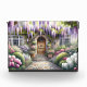 This enchanting scene captures the essence of a storybook cottage garden, bursting with lush blooms and cascading wisteria in soft purples, pinks, and whites. A charming arched wooden door welcomes you through a stone path framed by flowering shrubs, manicured greenery, and dreamy light filtering through the foliage. The overall mood is peaceful, romantic, and full of secret garden nostalgia—perfectly aligned with cottagecore and fairytale aesthetics. The composition draws you inward, evoking a sense of wonder and serenity beneath the floral canopy. AI generated artwork.