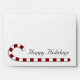 Envelope with cute country style candy cane illustration in the classic peppermint colour scheme red and white with the greeting happy holidays in black text. The greeting can be customised if you wish to write Merry Christmas or your own greeting.