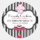 Pretty bakery business stickers done in a black and white striped background, with a black bold band, across the middle, and a decorative black edged white text area, on the front. Sweet graphics of a pink, white, and green cupcake and a cake stand with brownies, decorate the top and bottom, of the sticker. Personalise the pink and black text to suit your bakery needs.