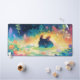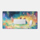 Brighten your desk with this vibrant and whimsical illustration of a dark blue axolotl resting peacefully on a lily pad. The adorable creature features contrasting orange-red gills and tail fins, adding a pop of warmth against the cool aquatic blues. The surrounding scene is a fantastical rainbow forest pond, where lush foliage in shades of deep purple, blue, and emerald green cascades from above. The foreground is adorned with large, brightly colored lotus flowers in brilliant hues of pink, orange, and white, all set against sparkling, sunlit water. This dreamy design creates a magical, nature-inspired focal point for any workspace. This desk mat offers versatile use for various other businesses, events, or situations.