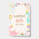 Celebrate Karen's 6th birthday with this enchanting dinosaur princess-themed invitation! This charming card features a pastel background adorned with cute cartoon dinosaurs wearing crowns, adding a royal touch to the prehistoric fun. The card is decorated with colourful bunting, balloons, and festive elements, making it perfect for a magical and fun-filled celebration. Invite friends and family to join in on the joy and make this special day unforgettable.