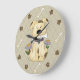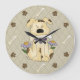 Cute dog theme wall clock done in a khaki coloured diamond pattern background. Graphics of a cartoon puppy dog, in the centre, with a bone in his mouth. The numbers on the clock are done in brown paw prints and bones. Customise to add any text you want. Makes a great gift idea.