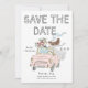 Whimsical Doodle Quirky Save the Date - A fun, trendy hand drawn Save the Date featuring the happy couple riding in a pink convertible with a bouquet of flowers and quirky hand written typography. The back of the invitation is a blue striped background. So fun!