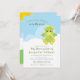This adorable baby shower invitation features green dragon sitting on a cloud announcing a new baby dragon is on the way! Back features green grass, tower and smiling sun on blue and white cloud background. Easy to personalise with custom options. Click the "personalise" button to change text or further customise.