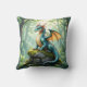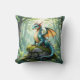 Dragon themed throw pillow for boy's room. A whimsical dragon, rendered in a detailed watercolor illustration style, perches atop a moss-covered ancient stone ruin. Sunlight filters through the dense forest canopy, illuminating dust motes dancing in the air. The dragon's scales shimmer with iridescent hues, and its eyes hold a gentle, knowing, fun fantasy art. Cute for a boy's room.