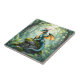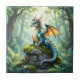 Dragon themed tile. A whimsical dragon, rendered in a detailed watercolor illustration style, perches atop a moss-covered ancient stone ruin. Sunlight filters through the dense forest canopy, illuminating dust motes dancing in the air. The dragon's scales shimmer with iridescent hues, and its eyes hold a gentle, knowing, fun fantasy art. Cute for a boy's room.