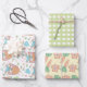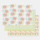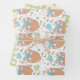 Whimsical Easter wrapping paper sheet : one with the cute pattern of a bunny and little flowers and hearts , one with a green Gingham pattern and one with carrots and orange flowers .