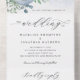 Design feature dusty blue rose watercolor and eucalyptus leaves with elegant script.