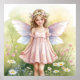 A beautiful fairy girl with soft pink wings standing among blooming flowers. Her daisy crown and gentle smile create a magical, peaceful feeling. Perfect for kids’ rooms, nurseries, or anyone who loves fairies and nature.