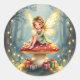 A pretty little fairy sitting atop a whimsical mushroom covered in Christmas lights and surrounded by gifts. A sweet whimsical illustration that add a cottage core touch to your envelopes.