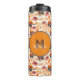 Whimsical Fall thermal tumbler features wheelbarrows of pumpkins, small floral bouquets and pale orange and white stripes. Customise with name and initial