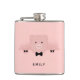 A personalised flask with a drawing of a cute pink pig's face. Wearing a black bow tie. Lifted up by his black cloven hooves and peering over at you. Cute and whimsical drawing. Set on a pink background with some faded hearts here and there.